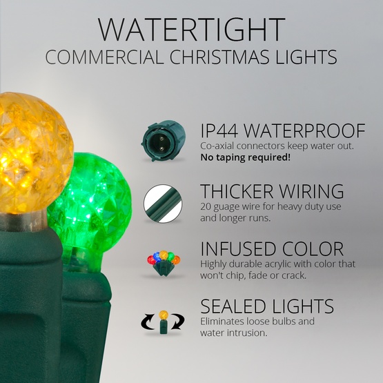 First, they're rated to last tens of thousands of hours which means no burnt out bulbs! Second, many LED lights are made with durable acrylic lenses which makes them incredibly hard to break. So if you're up on the ladder trying to hang Christmas lights and a light bulb decides to take a dive, there's no more shattered mess and the bulb will still work even after it has fallen.